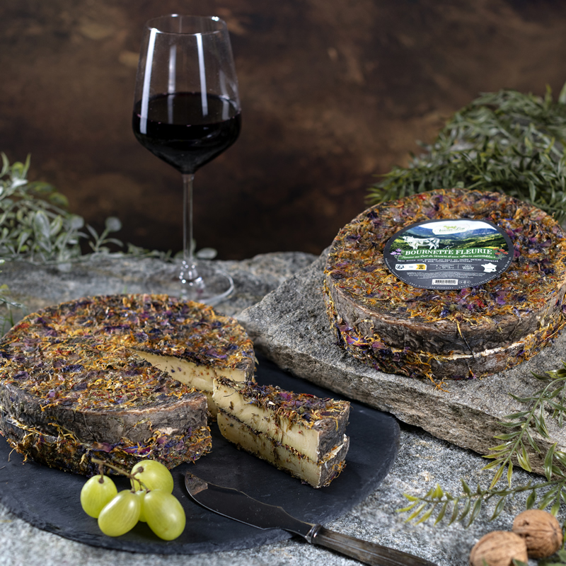 Le Bournette Fleurie, fromage artisanal de Savoie, offre une pâte onctueuse et fondante aux arômes délicats de fleurs de montagne.