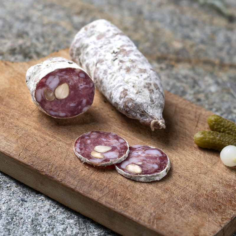 Alliant le goût franc du saucisson savoyard à la finesse des truffes, ce saucisson artisanal séduit par sa texture ferme et ses arômes riches et parfumés.